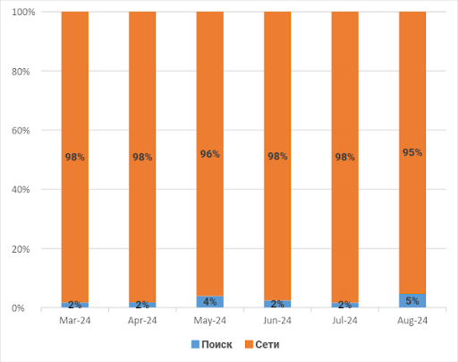 1.Стали делать упор на РСЯ и оставили основные запросы по поиску – процентное соотношение и количество заявок за период март-август: